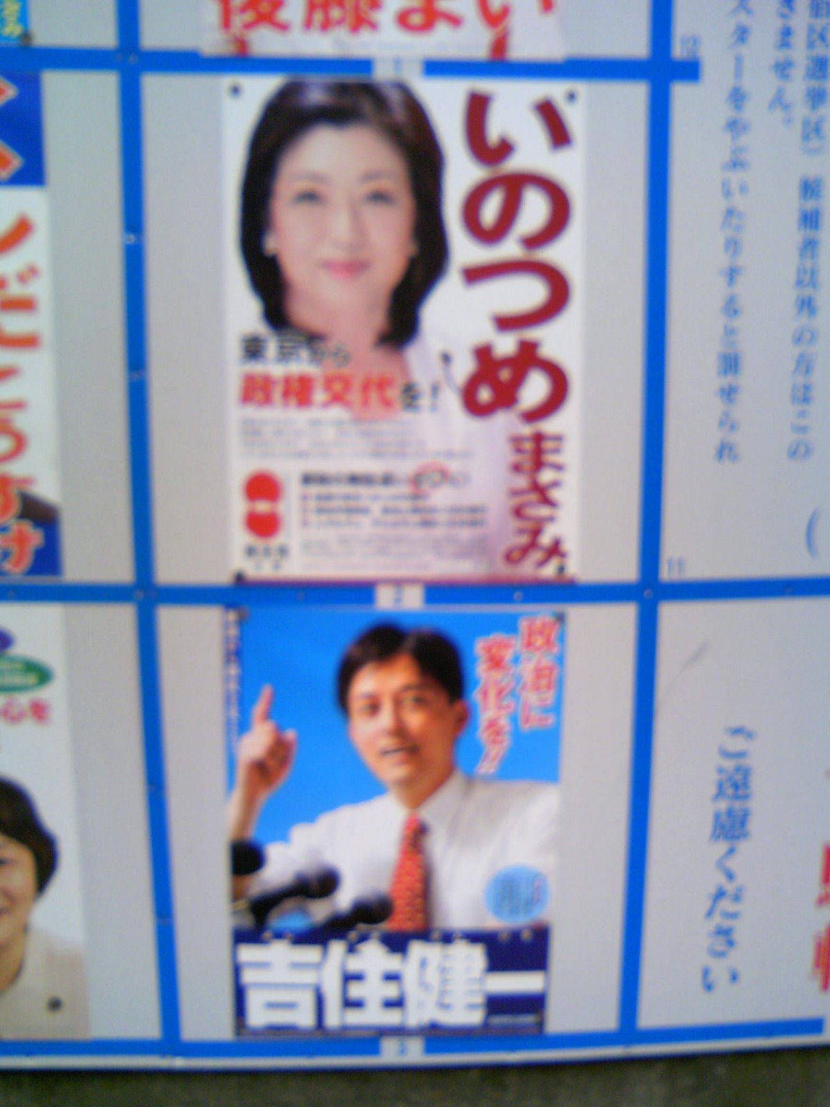 With that story for an introduction, I am making this an open thread for things seen and heard during the campaign for the Tokyo assembly. Post your stories in the comments. And if you have good pictures, send them along and I’ll post them on the blog.