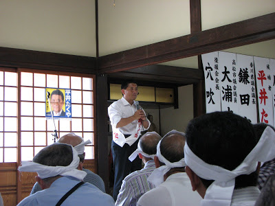 I saw very much the same energy later that evening when I went to a music hall in Kagawa’s second district where candidate Tamaki Yuichiro, a former finance ministry official who quit the ministry in 2005 to run for office, spurning the LDP to run as the DPJ candidate, was giving an address. In my predictions for Kagawa, I said Tamaki was in a tight race and would probably lose — but I may have underestimated him. Tamaki was introduced by Uematsu Emiko, the DPJ upper house member from Kagawa who won her seat in 2007 by defeating the LDP incumbent who had held the seat for thirty years; an SDPJ official; the granddaughter of Ohira Masayoshi, who came from Kagawa and is a distant relative of Tamaki; and finally, Fujii Hirohisa.